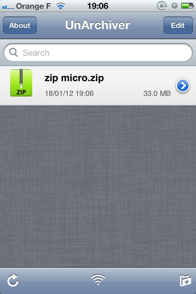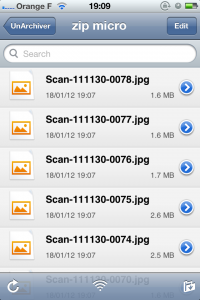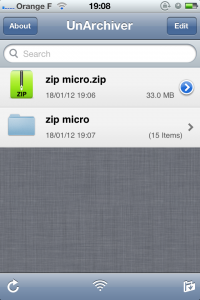 Ce que je préfère sur les iDevice, ce sont tous les petits utilitaires que les développeurs inventent pour nous simplifier la vie. UnArchiver est une application tout ce qu’il y a de plus simple, qui vous permettra de décompresser des fichiers .zip ou .RAR (ou même .tar). Rien de bien sorcier: l’application affiche vos fichiers compressés sur l’écran principal. Pour en charger un sur votre iDevice à partir de votre ordinateur, vous pouvez utiliser le Wifi (en cliquant sur l’icône dédiée en bas au centre de l’écran, vous n’aurez qu’à suivre les instructions). Le chargement est plutôt rapide. Mais vous pouvez également récupérer des fichiers compressés à partir d’autres applications, directement sur votre iDevice!