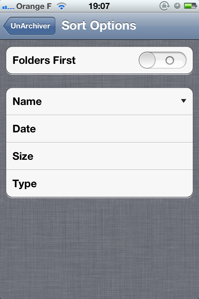 Si vous avez beaucoup de fichiers de ce type à gérer, vous pouvez utiliser l’icône en bas à droite de l’écran principal. Cela vous permet de définir les options de tri de l’application: par nom, date, taille ou type de fichiers. Vous pouvez également placer vos dossiers en première place.