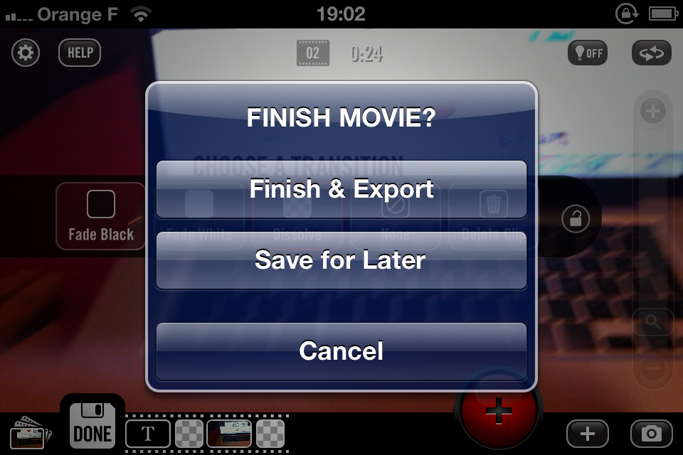 Une fois votre film terminé, vous pouvez soit le finir immédiatement, soit le sauvegarder pour plus tard. Il faut savoir que finir un film prend un peu de temps, mais également de la batterie: cette option s’avère donc parfois utile pour ne pas achever votre iDevice.