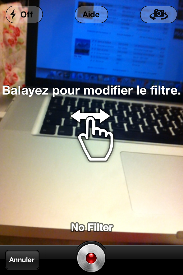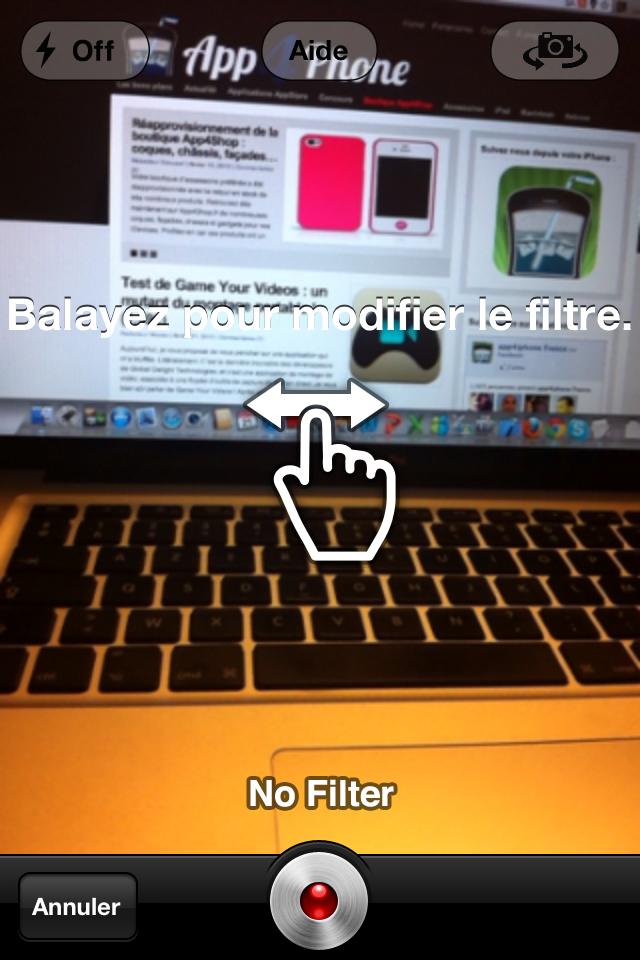 Dès lors, vous avez le choix entre utiliser un filtre ou non pour votre vidéo. Pour cela, il suffit d’effectuer un slide sur l’écran qui vous permettra de naviguer entre les différents filtres proposés. Vous pouvez également activer le flash ou bien la caméra frontale, comme dans l’application native.
