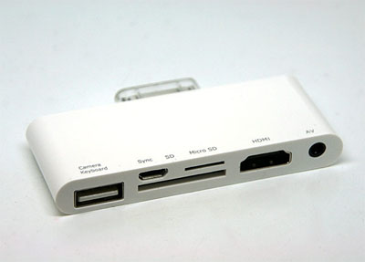 Un véritable couteau Suisse pour votre iPad. Ce kit de connexion intègre : 1 port HDMI, 1 port AV, 1 port USB, 1 port pour carte SD, 1 port pour carte micro SD et 1 port dédié à la synchronisation avec votre ordinateur. De quoi utiliser efficacement les médias stockés sur votre iPad. Vous pouvez l’acheter au prix de 69,95€ sur App4Shop.