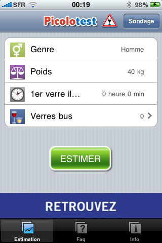 Une application très pratique : Picolotest. Elle vous permet grâce à son interface très simple d’utilisation (même lors de loooooooooooooooooooogues soirées) de suivre votre consommation d’alcool et ainsi d’obtenir votre degré d’alcoolémie. Attention : ce n’est qu’un éthylotest virtuel, et il est fortement déconseillé de prendre le volant après avoir consommé de l’alcool bien évidemment.