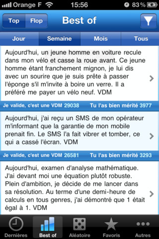 Vous croyez réellement avoir une vie pourrie? N’attendez plus et téléchargez VDM : cette application regroupe les publications du site éponyme qui regroupe les anecdotes et petits malheurs du quotidien qui nous font bien rire (et surtout relativiser!). A dégainer lorsqu’on a un peu de temps à faire passer ou pour se redonner le sourire.