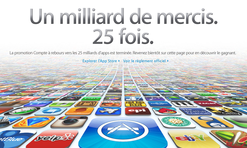 On vous en avait parlé récemment ici, Apple a enfin compté et déterminé le 25 000 000 000e téléchargement d’application sur l’App Store afin de délivrer les 10 000$ de récompense au gagnant(e) (argent en chèque cadeau valable sur l’App Store uniquement).