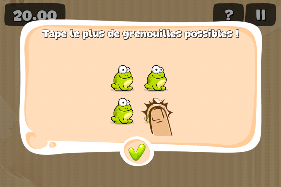 Le premier jeu s’appelle « Tape la grenouille » et propose un concept on ne peut plus simple: vous devez, à l’aide de votre doigt, taper sur le plus grand nombre de grenouilles possible, le tout dans un temps imparti. Cependant, quelques grenouilles avec des casques devront être tapées plusieurs fois avant de disparaître.