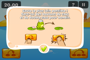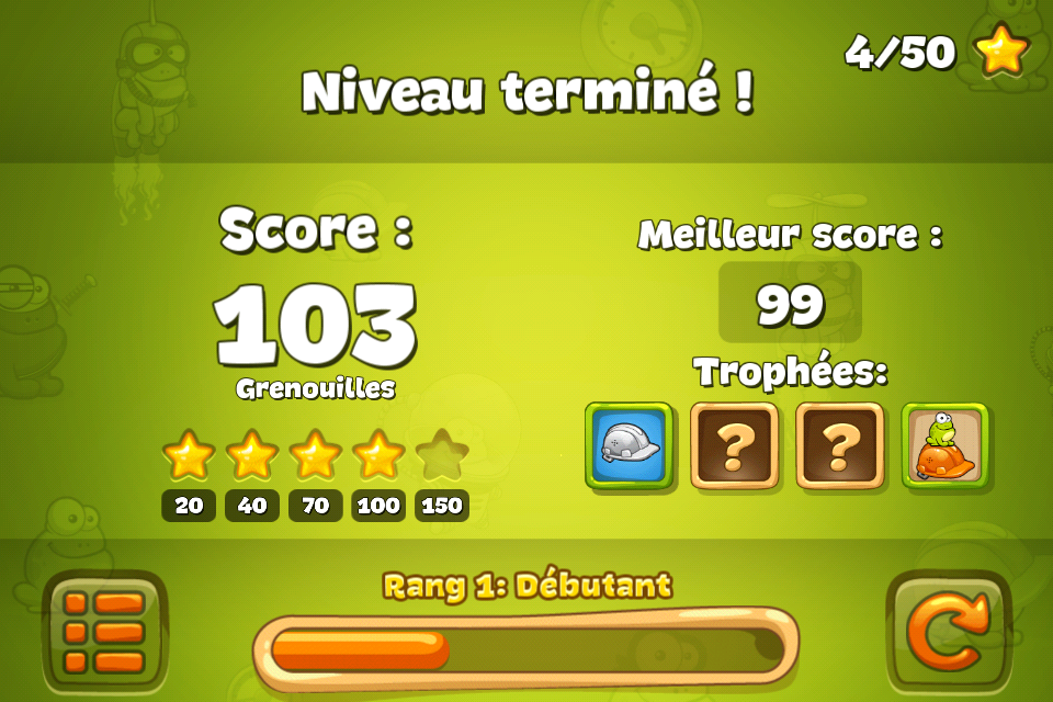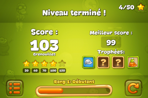 A chaque fois, votre score vous permet de gagner un certain nombre d’étoiles qui vous permettent de débloquer les niveaux suivants. Vous gagnez également de l’expérience vous permettant d’obtenir de nouveaux rangs, le but ultime étant de devenir le roi des grenouilles.