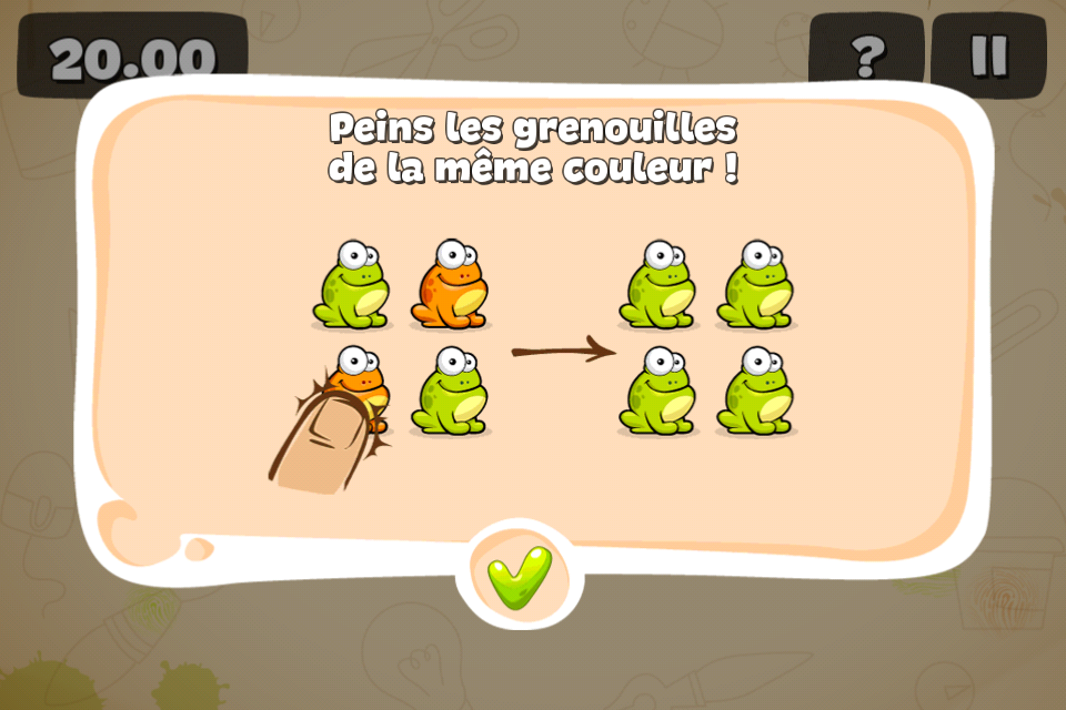 Le troisième jeu, « Peins la grenouille », vous demande de peindre toutes les grenouilles de la même couleur. Pour cela, il suffit de toucher les grenouilles « intruses » pour les repeindre, le tout se faisant encore une fois dans une certaine limite de temps (qui est finalement la principale difficulté du jeu).