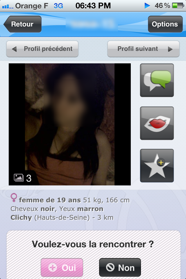 L’option « voulez vous la rencontrer » est disponible, mais également l’envoi de message, de bisous et d’ajout dans les favoris. Attention tout de même car ces dernières options sont utilisables uniquement avec un compte « Premium » soit un abonnement de 9,99€/mois. Légérement dommage pour ceux qui ne souhaitent pas investir financièrement pour faire des rencontres (il est vrai que les sites et services totalement gratuits sont rares aujourd’hui) mais ce tarif reste tout de même inférieur à celui proposé par la majorité des autres sites de rencontres.