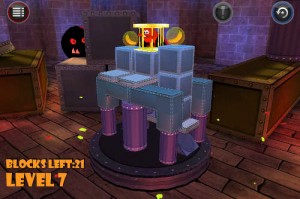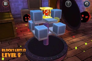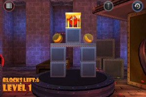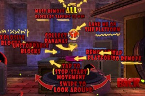 Niveau jouabilité, tout est très simple. En laissant appuyé le doigt sur l’écran et en le dirigeant, on tourne autour de la plateforme afin de bien étudier l’architecture de chaque niveau. Il faut ensuite appuyer sur un bloc pour le supprimer, et ainsi entamer le descente de notre bestiole. Pour que le niveau soit réussi, il faut éliminer autant de blocs qu’indiqué, et surtout que la cage contenant notre héros reste sur la plateforme. Pour une réussite totale, il ne devra rester sur la plateforme que la bestiole et les deux bananes.