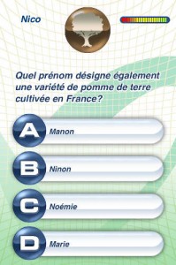 On passe ensuite à la question proprement dite, et les 4 propositions de réponses, parmi lesquelles une seule est la bonne. Dans la partie supérieure de l’écran, de gauche à droite, apparaissent votre nom, l’icône de catégorie de la question, et le temps imparti pour répondre à la question. Plus vous irez vite à donner la bonne réponse, plus vous obtiendrez de points de QC, Quotient de Connaissances. Que vous répondiez bien ou mal à une question, vous bénéficierez à chaque fois d’une petite carte explicative relative à la question posée précédemment. Celles-ci sont concises, claires et très enrichissantes. La très bonne idée de ce quiz réside dans le fait que le niveau de difficulté des questions varie automatiquement en fonction de vos réponses : si vous répondez bien à la première question, dans une catégorie quelconque, la deuxième question sera de niveau 2, dans une autre catégorie. Si vous répondez bien à cette deuxième question, la question 3 sera de difficulté 3, et par contre si vous répondez mal à la deuxième question, la question 3 sera de difficulté 1.