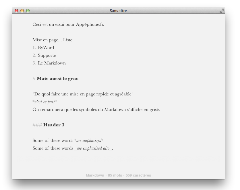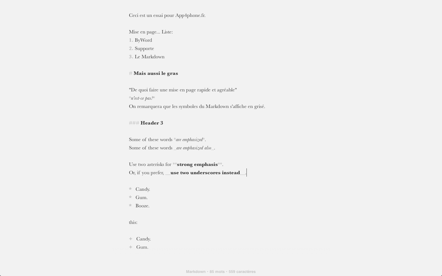 Pour être encore plus immergé dans votre composition, ByWord propose également un très beau mode plein écran accessible par un raccourci très simple: cmd+entrée. Le tout offre vraiment un très très beau rendu.