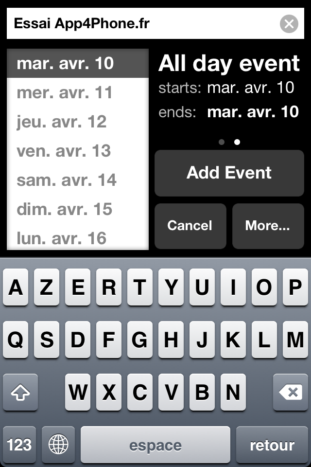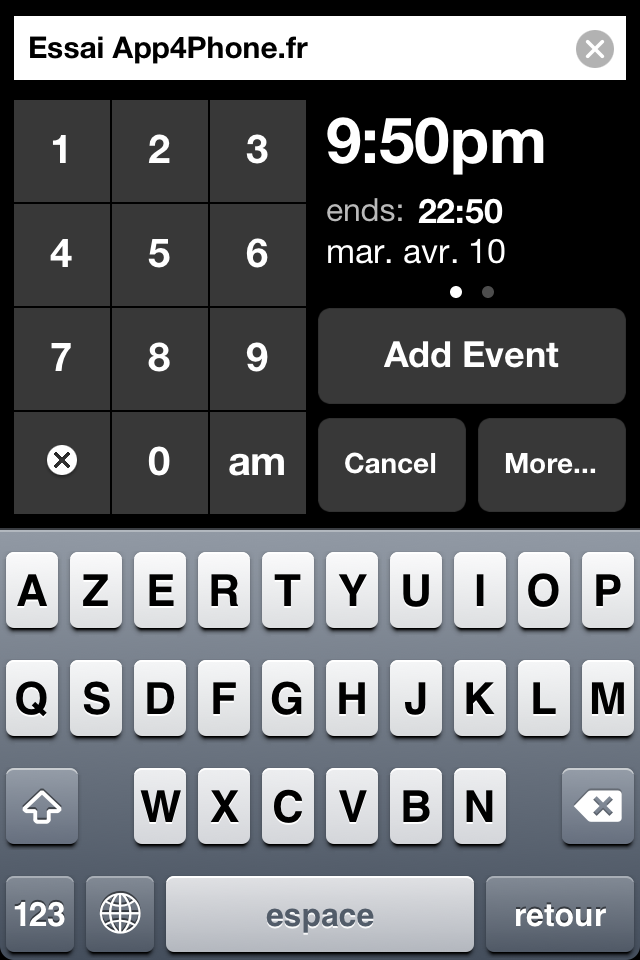 Pour créer un événement à un jour particulier, il suffit de toucher l’icône « + » à droite. Un écran d’ajout rapide vous permet de créer un événement en quelques secondes, le pavé numérique permettant d’associer rapidement un horaire au rendez-vous entré.