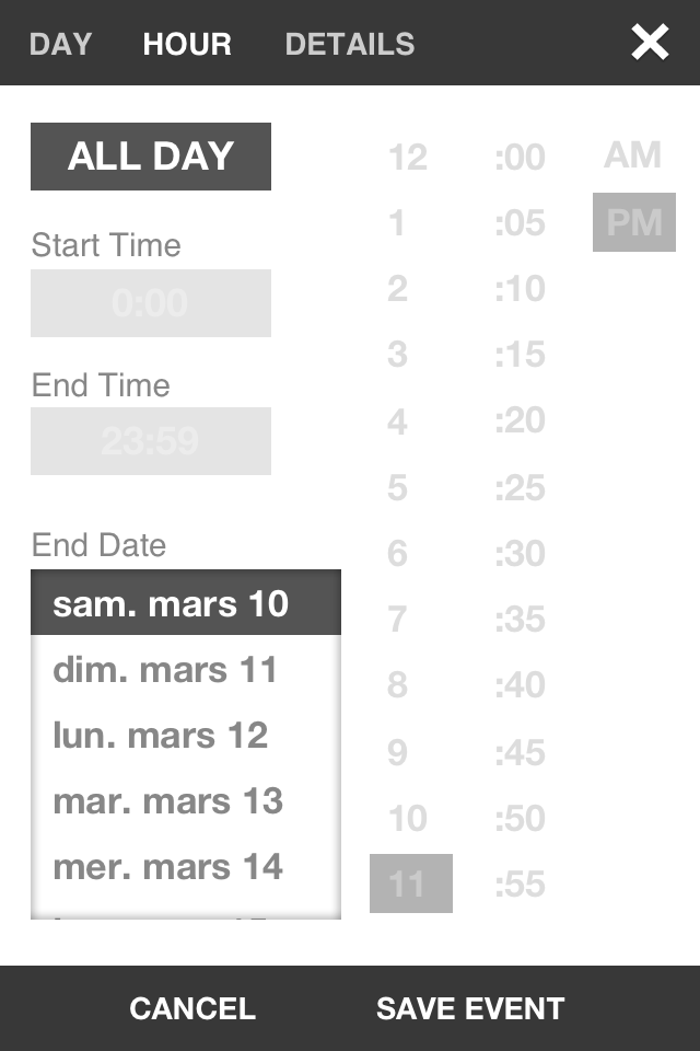 Un slide effectué sur l’horaire permet d’affecter une date de fin à votre événement.