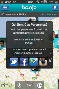 Toujours plus loin dans le « je veux tout savoir de ce que font mes amis, à tel moment, et surtout où« , Ban.jo est un moteur de recherche de connections des utilisateurs de réseaux sociaux, afin de répertorier rapidement et facilement leur géolocalisation en fonction de leurs posts.
