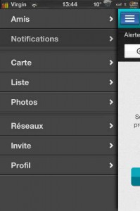Grâce au bouton supérieur gauche, vous accéderez à différentes options, afin de pouvoir régler plus à votre goût le fonctionnement de l’application. Via l’onglet Amis, vous parviendrez aux dernières nouvelles postées par vos amis, par date et par heure. L’onglet Notifications vous permettra de configurer celles-ci, pour ne jamais manquer un ami proche de chez vous. Il est par exemple possible de recevoir une notification lorsque l’un de vos amis poste un message dans un rayon de 500m, 1 Km, 3 Kms, 5 Kms et 10Kms de vous. Ces alertes peuvent aussi être mises en pause durant 1h, 4h, 8h, 24h ou une semaine.