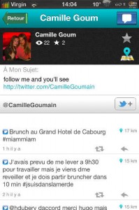 En appuyant sur la photo d’un des utilisateurs proches, vous arriverez sur le mur de celui-ci, avec sa photo, son nom, une petite description, et ses derniers posts, avec l’heure et la distance vous séparant des lieux de ces posts. Vous pourrez dès lors commenter les posts, ajouter cette personne à vos favoris Ban.jo, l’ajouter à vos contacts ou la localiser rapidement sur la carte.