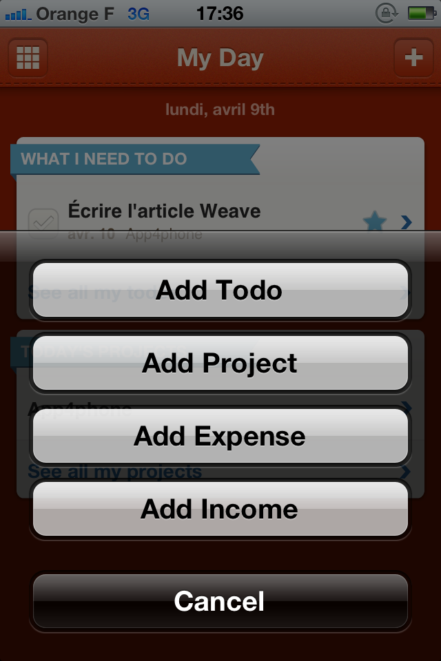 Ainsi, en touchant le bouton « + », vous pourrez soit créer une nouvelle tâche, soit un nouveau projet, ou encore ajouter une dépense ou un revenu.