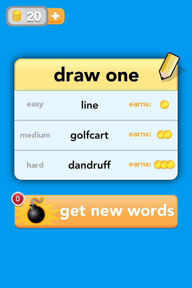 Une fois la partie créée, vous devrez choisir l’un des trois mots proposés et le faire deviner à votre adversaire à l’aide de dessins. Il faut savoir que chaque mot est associé à un nombre de pièces: en général, plus le mot est difficile, plus il permet de récolter des pièces qui vous permettront quant à elles de débloquer de nouvelles couleurs pour vos dessins. Si les mots ne vous conviennent pas, vous pourrez utiliser une bombe pour en obtenir de nouveaux, mais sachez que vous disposez de peu de bombes dans la version gratuite, et qu’il vous faudra ensuite passer par la case boutique pour en avoir d’autres.