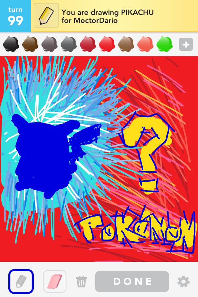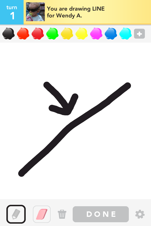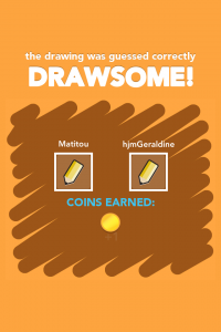 Ici, je dois par exemple faire deviner le mot « Ligne ». Bon, ce n’est pas ce qu’il y a de plus créatif, je l’admets, du coup vous aurez le droit à un petit bonus à la fin de ce test pour illustrer les possibilités de l’app. Pour dessiner votre mot, vous n’aurez au début que quelques couleurs (vous pourrez en débloquer d’autres grâce à vos pièces). Vous pourrez cependant choisir la taille de votre pinceau à l’aide de l’icône « Crayon » en bas à gauche de l’écran, effacer une partie à l’aide de la « Gomme », ou encore ouvrir une nouvelle page grâce à l’icône « Corbeille ». Notez bien que, peu importe ce que vous faîtes, votre coéquipier verra tout: vous pouvez donc faire plusieurs dessins, utiliser une nouvelle feuille si vous n’êtes pas satisfait de ce que vous avez fait sur la première, etc.