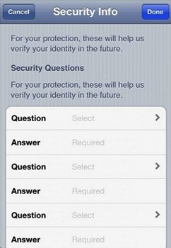 Ainsi, une notification de sécurité est apparue chez certains. 3 questions et 3 réponses liées sont demandées à l’utilisateur afin de renforcer la sécurité du compte de celui-ci. Ces questions / réponses sont directement liées et enregistrées à votre compte App Store (et iTunes forcement). Il sera aussi nécessaire de renseigner une deuxième adresse mail, notion qui permet encore d’améliorer la sécurité de l’Apple ID.