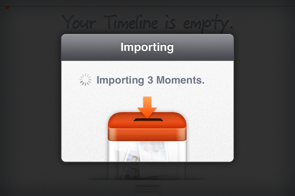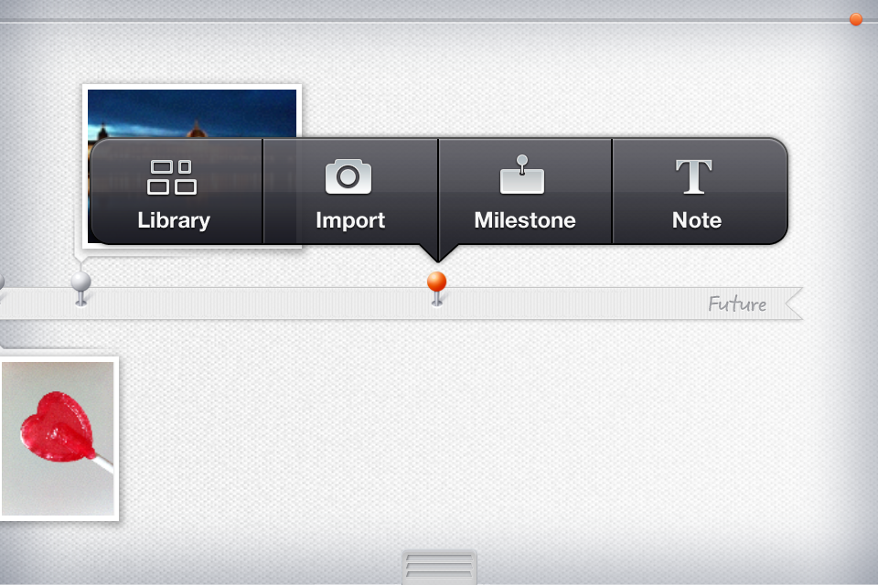 En touchant un point de votre timeline au choix, vous pourrez ajouter une nouvelle image de votre librairie (qui contient l’ensemble de vos photos et pas seulement celles présentes sur la timeline), importer de nouvelles images, ajouter une « étape importante » (un peu à l’image des événements marquants de Facebook), ou encore ajouter une simple note.
