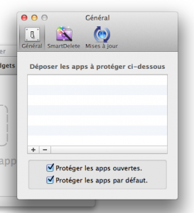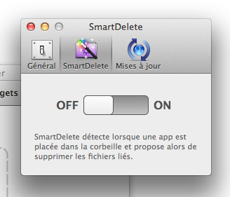 L’onglet « SmartDelete » vous permet quant à lui de lancer automatiquement AppCleaner dès lors que vous placez une application dans la corbeille: ainsi, vous pouvez continuer à supprimer vos applications simplement tout en ayant les fonctionnalités avancées d’AppCleaner pour éviter de laisser un fichier isolé.