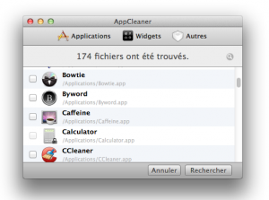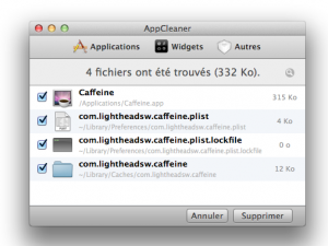 Ici, un petit exemple avec Caffeine (mais ne la supprimez pas, elle est trop bien pour ça!). On remarque qu’AppCleaner détecte trois autres fichiers différents de l’app en elle-même qui seront donc supprimés avec si je clique sur « Supprimer ». A noter qu’il est tout à fait possible de décocher certains fichiers si vous souhaitez les préserver, ce qui vous assure un contrôle total sur ce que vous faîtes.