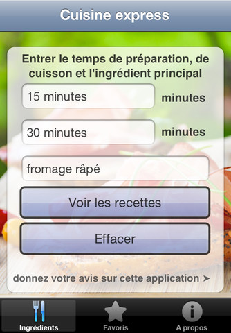 Un concept un peu singulier dans l’impressionnant tas d’applications traitant le sujet : cuisine express vous permet de cuisiner des petits plats rapides, en cas de manque de temps. Il vous suffira de rentrer un temps de préparation maximal souhaité, un temps de cuisson (s’il y en a), ajouter ou non un ingrédient et bingo vous avez trouvé l’entrée, plat ou dessert idéal.