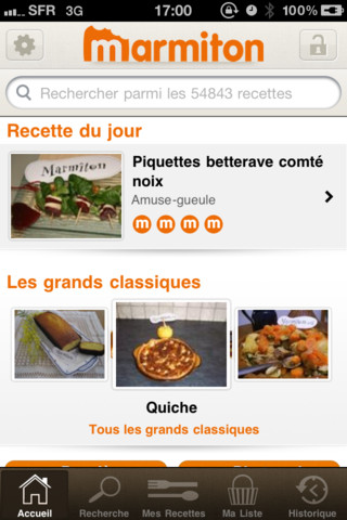 Sans doute l’application la plus connue et reconnue sur l’App Store. Marmiton possède un bon nombre de recettes et est une belle application sur iPhone et iPad. Elle vous permettra de rechercher selon différents critères des recettes (par ingrédient, par nom). Elle possède également des vidéos de démonstration, et un mode « en cuisine » afin d’activer des minuteurs, et de suivre pas à pas la recette. Elle est gratuite et compatible iPhone (juste ci-dessous) et iPad (ici).