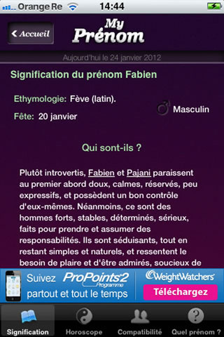 Pour le curieux, et qui y croit bien sûr (moi je m’en sers pour autre chose, c’est une source d’inspiration). Cette application vous permet de tout savoir sur les prénoms, l’étymologie, le caractère de la personne, etc… Sincèrement, c’est toujours intéressant de savoir d’où provient un prénom. Bien réalisée, et gratuite, à ne pas manquer !