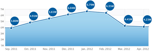 Selon une étude américaine (réalisée sur l’App Store US), les applications iOS téléchargées sont passées de 6,35 millions en février 2012 à 4,45 millions le mois suivant. La chute de téléchargement s’est légèrement poursuivie en avril puisque le chiffre est passé à 4,23 millions.