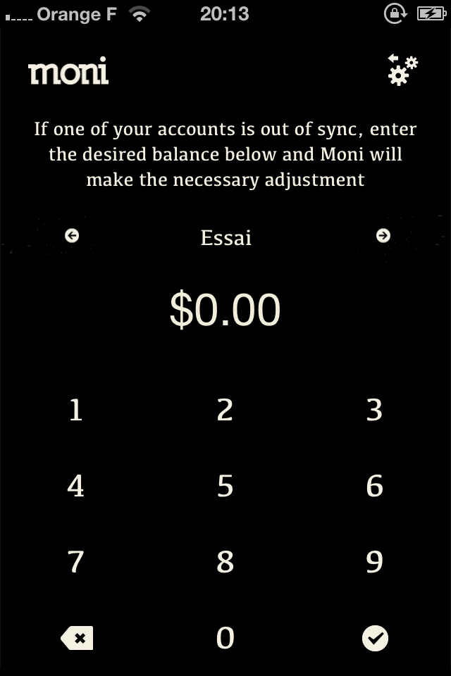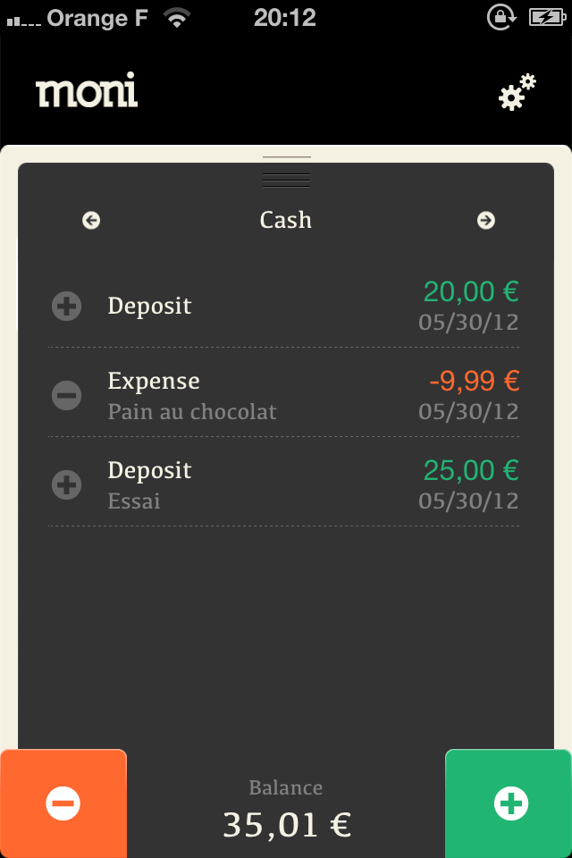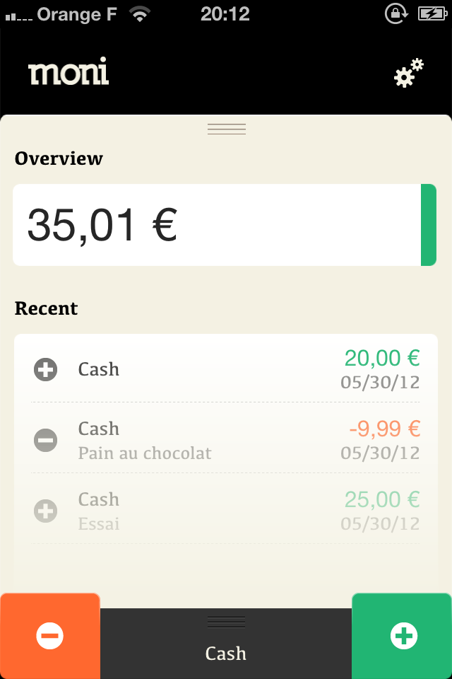 L’interface s’avère minimaliste: en bas, vous retrouvez le nom du compte en question (ici « cash », pour votre argent liquide par exemple), en haut la somme disponible dessus, avec une indication couleur pour savoir à tout moment où vous en êtes dans votre gestion. Enfin, on retrouve le détail de vos opérations en-dessous, avec une distinction orange et verte pour les dépenses et les revenus.