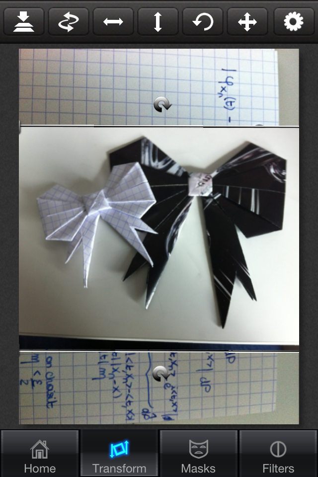Une fois cette première étape préremplie, les deux photos s’affichent l’une sur l’autre. Il faut alors toucher l’onglet « Transform » pour commencer la retouche: c’est là que vous pourrez redimensionner ou faire effectuer une rotation à la photo de devant. Le bouton « paramètres » vous permet de modifier la transparence et le mode de fusion. Enfin, l’icône « + » vous permettra de redimensionner automatiquement la photo du premier plan à la taille de l’arrière-plan (cela est cependant déconseillé si les deux photos n’ont le même format).