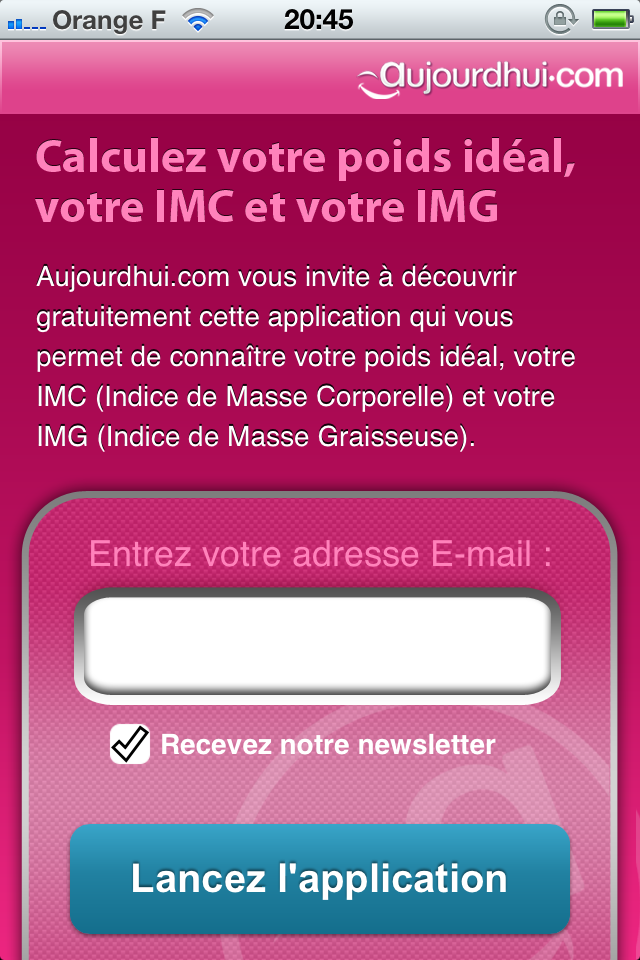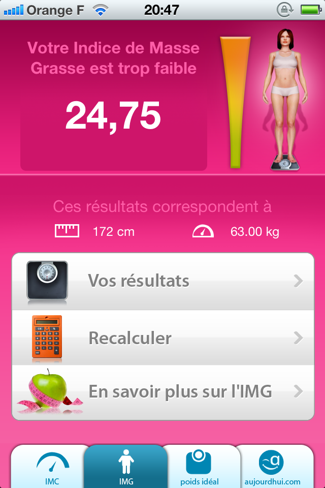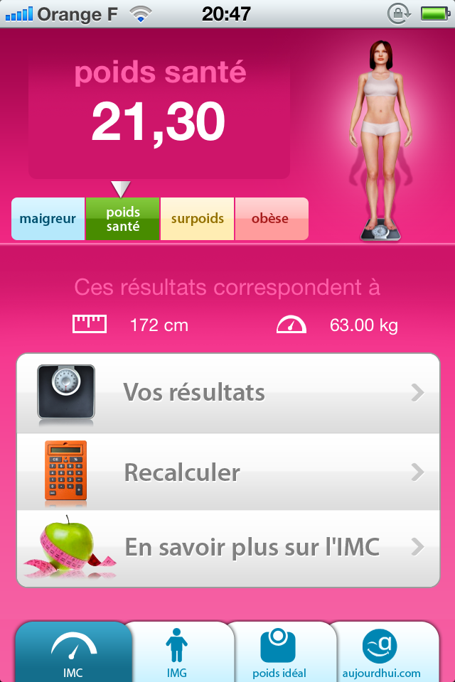 L’été approche… C’est pourquoi beaucoup de personnes commencent à penser « Régimes »! Mais avez-vous réellement besoin de vous affoler? Même si cela n’est pas suffisant pour savoir si l’on est en bonne santé physique, calculer son IMC permet d’avoir une idée plus ou moins exacte sur votre poids idéal. Aujourdhui.com vous propose pour cela Calculez votre Poids Idéal, une application gratuite qui vous permettra de le faire très simplement.
