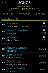 La partie « jouer » est intéressante, car elle vous permet de choisir une chanson parmi plusieurs, pour ensuite la jouer en suivant une sorte de guide propre à l’application. Seul bémol: vous ne possédez par défaut que quelques chansons, et toutes les autres seront à acheter via un achat in-app, bien que l’éditeur vous offre « généreusement » de débloquer une chanson de votre choix…