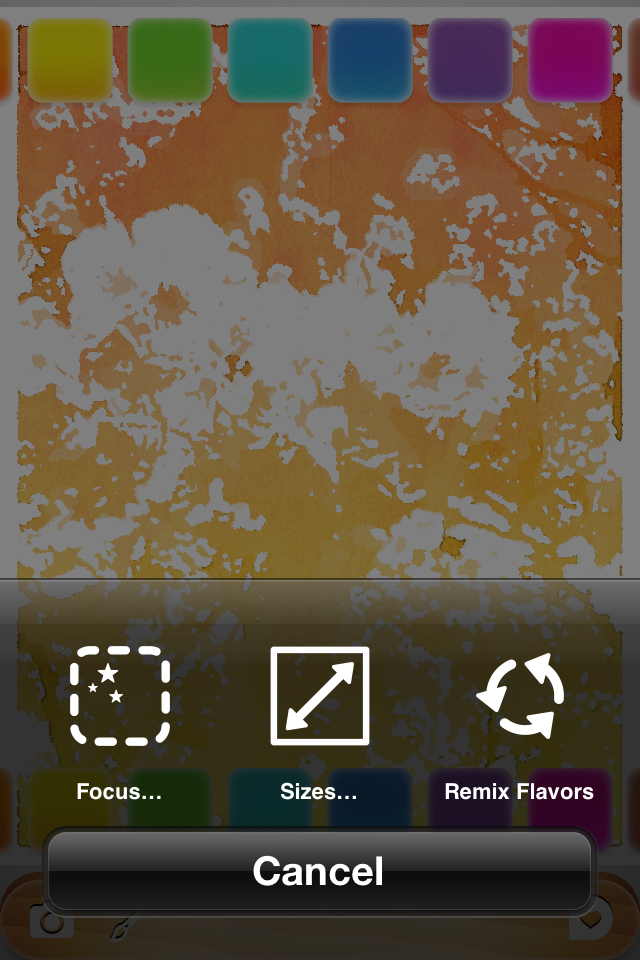 Si vous touchez l’icône du pinceau dans le menu, vous pourrez encore accéder à quelques fonctionnalités, à savoir un « focus » qui réduit plus ou moins l’effet aquarelle, un outil vous permettant de choisir la taille de sortie de l’image, et enfin un bouton vous permettant de générer aléatoirement un dégradé différent.