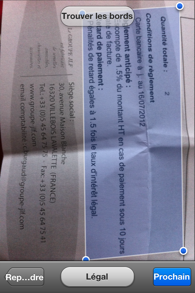 Si votre photo est bien prise, l’application se chargera elle-même de trouver les bords. Pour ma part, ma feuille était pliée: j’ai donc dû le faire manuellement, mais cela est très simple avec les points de contour. On choisit la taille de sortie avec le bouton central du bas, puis on clique sur « prochain ».