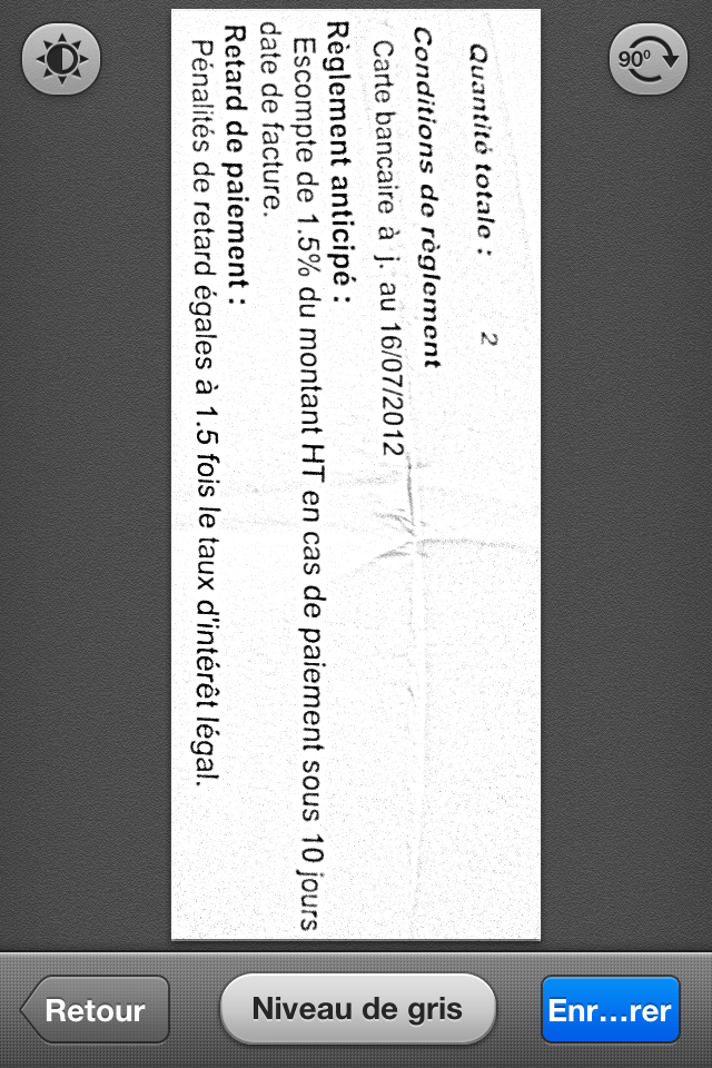 Et là, tadaaaa. Votre feuille est « scannée » comme par magie. Si le résultat ne vous convient pas, vous pouvez modifier la luminosité et le contaste en haut à gauche, et la rotation à droite. Vous pouvez également garder la photo originale ou utiliser les niveaux de gris avec le bouton central du bas. Ici, j’ai gardé le résultat « brut » pour que vous en ayez un aperçu: on voit bien que c’est déjà pas mal du tout!