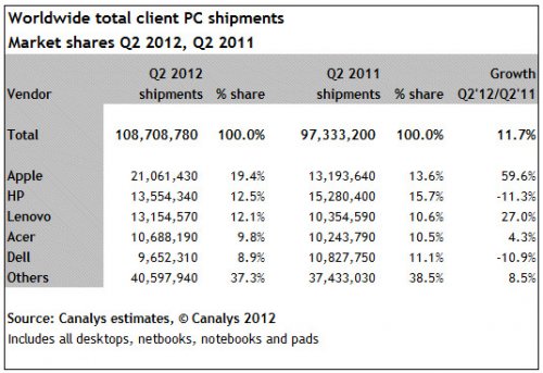 En prenant en compte la vente des tablettes et ordinateurs (portables ou non), la marque à la pomme possède plus de 19,4% du marché mondial. En comparaison à l’année passée, Apple grignote énormément le gâteau, puisque la firme américaine augmente son ratio de pratiquement 60%.