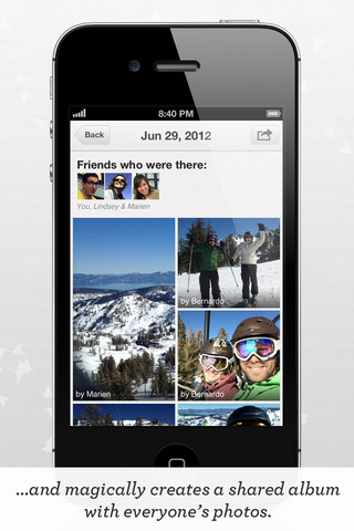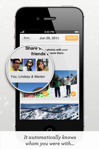 Comment l’app fonctionne-t-elle? Eh bien il vous suffit de vous connecter avec vos amis via Facebook, et l’application se chargera d’analyser les données de localisation automatiquement pour déterminer les moments où vous étiez avec vos amis, mais aussi de déterminer les photos susceptibles de contenir vos amis et donc intéressantes à partager.