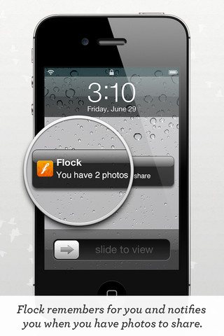Bien sûr, Flock n’upload pas n’importe quoi: il vous demandera d’abord votre avis afin de déterminer si vous souhaitez ou non partager telle ou telle photo avec vos amis. L’application se charge également de vous rappeler dès lors que vous avez de nouvelles photos à partager via une notification push.