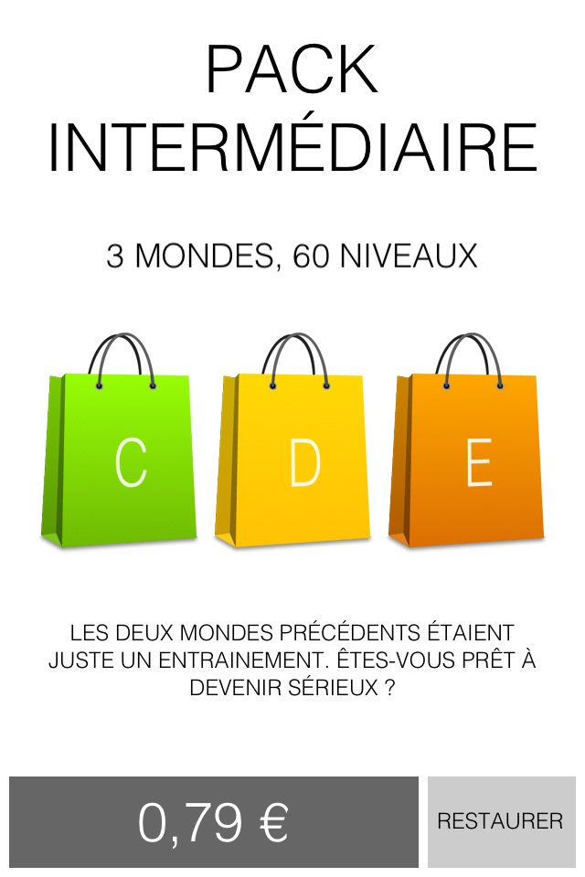 Si les 40 premiers niveaux sont gratuits, il faudra débourser 0,79€ par tranche de 60 niveaux supplémentaires pour débloquer les 120 suivants. A noter que la difficulté des niveaux s’accroit au fur et à mesure: ainsi les premiers niveaux passeront-ils ainsi rapidement, mais vous donneront un bon aperçu de l’application pour savoir si vous êtes accro ou non.