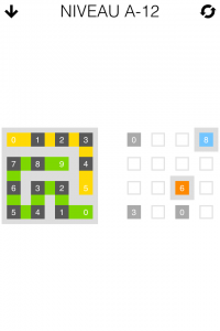 En effet, le principe du jeu est simple: on retrouve des petits carrés contenant des nombres que vous devez relier entre eux pour créer une suite de chiffres, allant des chiffres présents dans les carrés de couleur aux zéros grisés, en passant par les éventuelles indications données. Vous pouvez faire en sorte que les couleurs se croisent ou se superposent, mais seulement si les carrés comportent bien évidemment les mêmes chiffres.