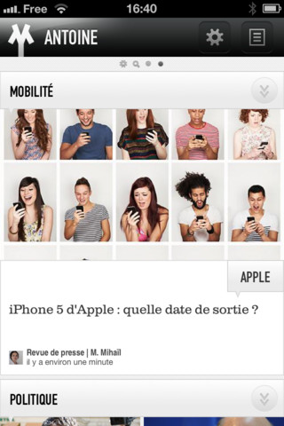 Néanmoins, si vous trouvez la une trop « complète » ou que vous n’êtes d’humeur qu’à lire une certaine partie de l’information, vous pourrez utiliser la petite icône située en haut à droite de l’écran pour choisir un thème bien particulier. Vous pouvez d’ailleurs gérer très simplement par cet intermédiaire les thèmes que vous souhaitez voir apparaître dans votre fil, ces derniers couvrant réellement une large palette de goûts.