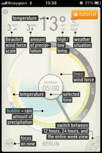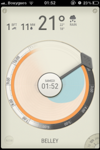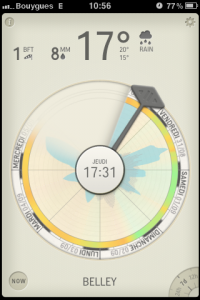 Comme vous le voyez sur les images, c’est grâce à une aiguille circulaire que vous choisirez manuellement les heures et que vous ferez défiler les journées en fonction de vos interrogations. De plus, vous constaterez qu’on l’on peut facilement afficher une météo à 7 jours qui donnera un rapide aperçu du temps qu’il fera globalement sur la journée.