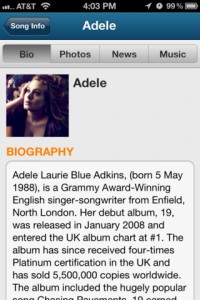 MetroLyrics ne s’arrête pas là puisqu’elle vous permet d’obtenir une biographie rapide du chanteur ou du groupe en question, des photos, des news, ou encore le top 5 de leurs chansons. L’application vous informe également si l’artiste est actuellement en tournée et vous affiche ses dates de concerts. Une vraie mine aux infos sans vous prendre la tête puisque l’application fait automatiquement la recherche pour vous.