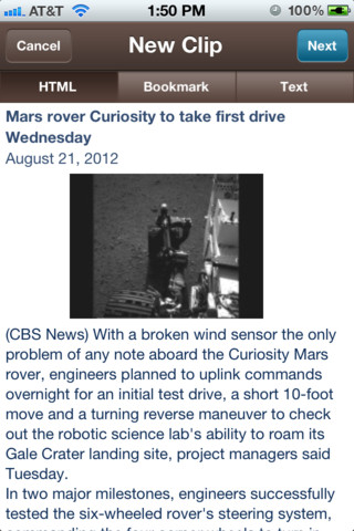 Le web est tellement grand que nos trouvailles deviennent vite un vaste foutoir où nous ne pouvons rien retrouver. ClipBoard (Télécharger sur l’App Store) va vous aider à sauvegarder et à organiser ce que vous trouvez sur Internet, à la manière de ses nombreuses applications concurrentes, telles qu’Evernote. Pourtant, ClipBoard va plus loin en ne se contentant pas de sauver le code HTML d’une page par exemple, mais bien sa structure entière. C’est-à-dire que l’application retient tout: texte, images, liens, etc.