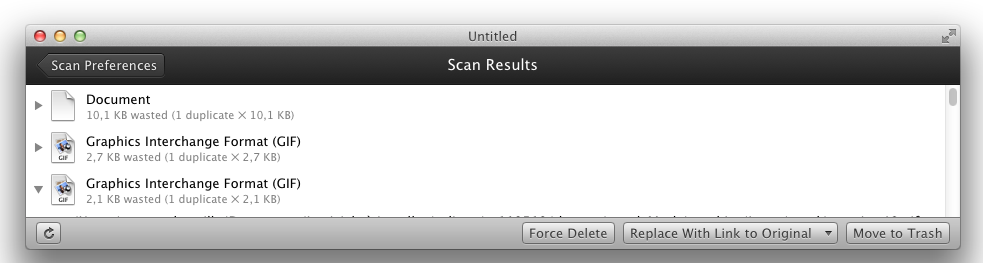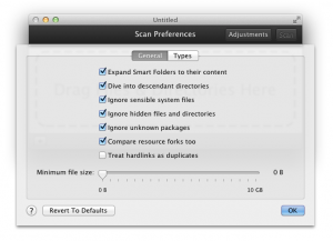 Si vous trouvez que l’application vous propose trop de « doubles » peu pertinents, vous n’aurez qu’à utiliser le bouton « Adjustments » afin d’affiner aux réglages. Vous pouvez même choisir les types auxquels vous souhaitez vous restreindre: pratique par exemple pour faire un peu de ménage dans les doubles .mp3 de votre bibliothèque iTunes.