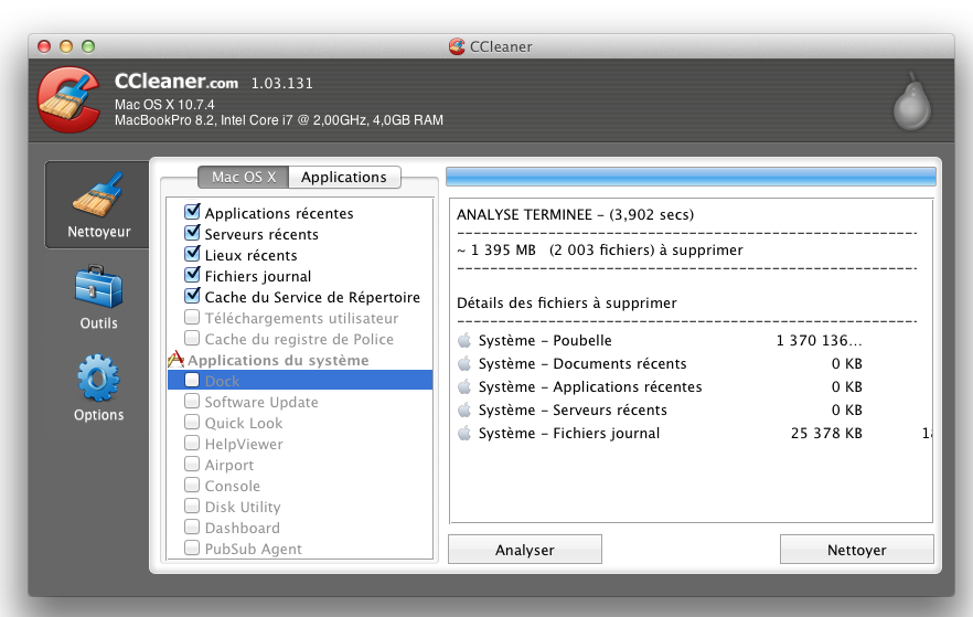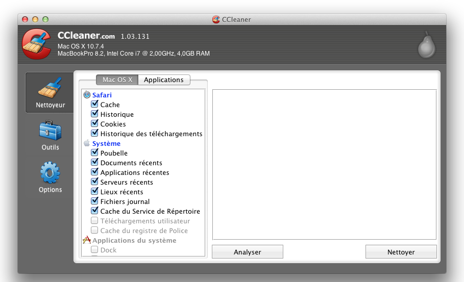 On a beau dire qu’un Mac est plus intelligent qu’un PC, il ne fait pas tout tout seul. Il faut parfois l’aider, notamment avec un nettoyage efficace et régulier de l’ensemble de vos fichiers. Pour aider à la tâche, on retrouve CCleaner, bien connu sur PC, mais qui existe également sur Mac. Cette application est notamment utilisée par les switcheurs (qui passent de Windows à Mac), et beaucoup lui préfèrent Onyx. Néanmoins, cette dernière n’étant pas disponible sur le Mac AppStore, nous nous contenterons de CCleaner, déjà bien pratique pour un « débutant ».