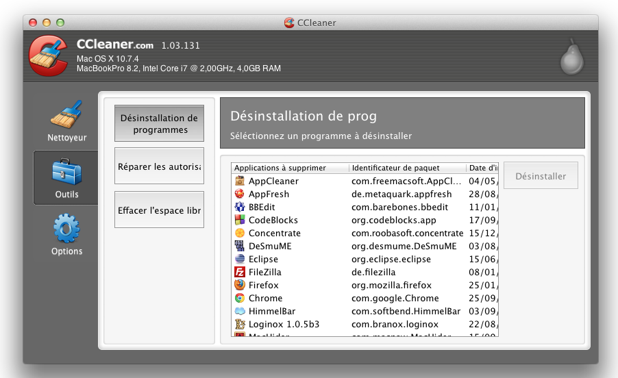A noter que CCleaner propose également une désinstallation « propre » des applications de votre Mac. Vous n’avez qu’à chercher l’application de votre choix dans la liste, puis à cliquer sur le bouton « Désinstaller »: CCleaner se charge de tout.